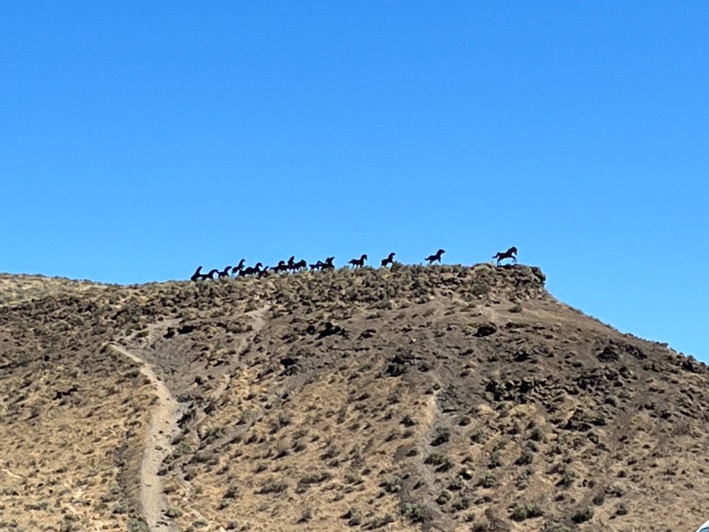 This is a sculpture created by the Chewelah sculptor David Govedare that is on a hill overlooking the Columbia River, entitled Grandfather Cuts Loose the Ponies. (Grandfather is a Symbol of the Great Spirit.) Originally he envisioned a 36-ft tall woven basket made of steel, tipped on its side to allow the horses to run free. The 15 galloping horses are life-size.