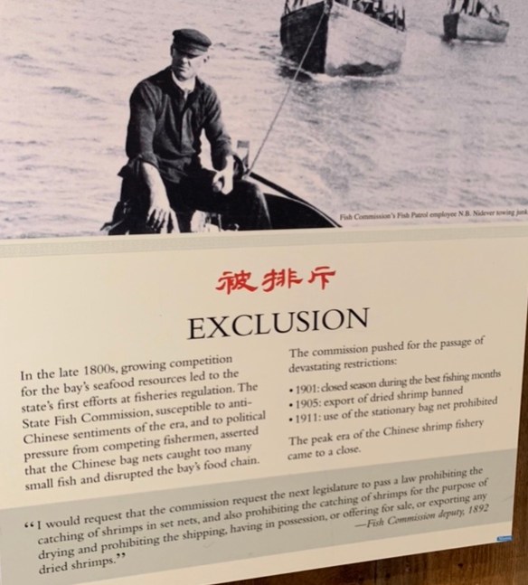 In the late 1800s, the Chinese American fishermen of China Camp would catch 3 million pounds of shrimp per year, much of which was exported to China and Hawaii. However, the economy of the village was severely harmed by the passage of laws in the early 1900s that outlawed the export of shrimp, closed the height of the shrimping season, and prohibited shrimping with bag nets which were the main method of catching shrimp. As a result, the population of China Camp greatly declined, leaving only one family — the Quans — carrying on shrimp fishing.